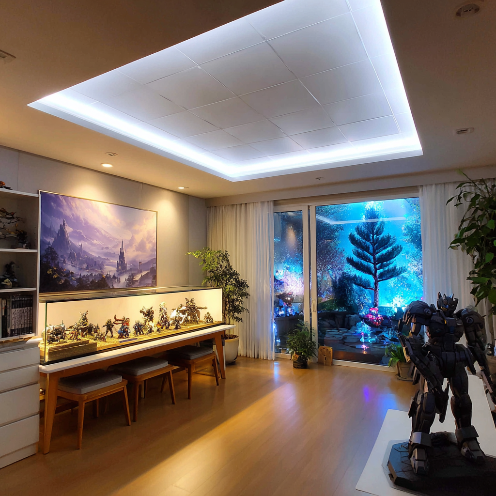 피규어방 전체의 톤을 통일시키면 훨씬 고급스럽습니다. 벽지는 무광 화이트나 라이트그레이, 바닥은 우드톤이 무난합니다. 러그나 커튼은 진열장 색상과 맞추면 완성도가 높아져요.