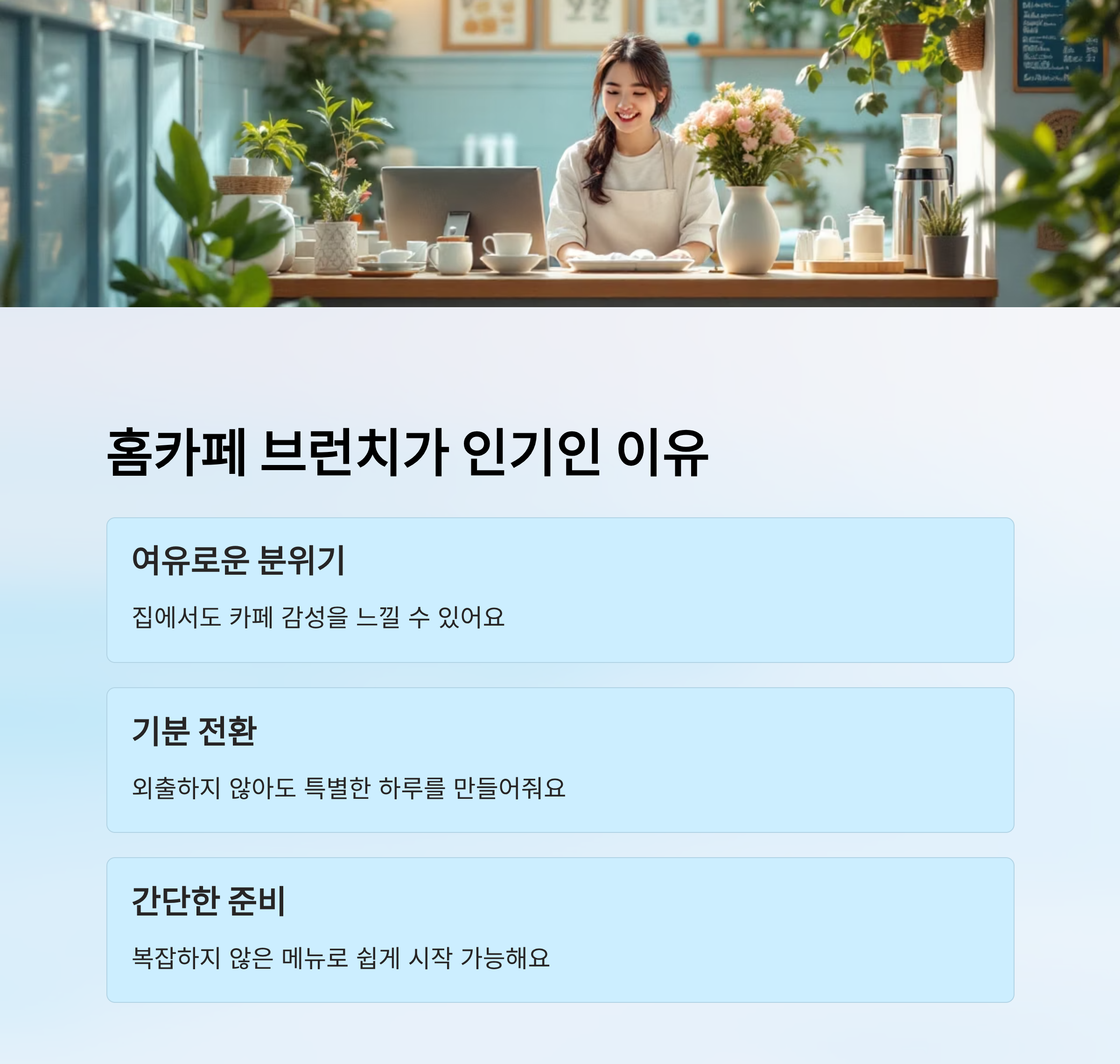 홈카페 브런치는 단순히 ‘집밥’과는 다릅니다. 여유로운 분위기 속에서 커피 한 잔과 곁들이는 간단한 메뉴가 하루를 특별하게 만들어주기 때문이죠. 코로나 이후 집에서 시간을 보내는 일이 늘어나면서, 나만의 작은 카페를 연출하는 문화가 생겼습니다. 실제로 제가 주말마다 홈카페를 차리다 보니, 외출하지 않아도 기분 전환이 확실히 되더라고요.